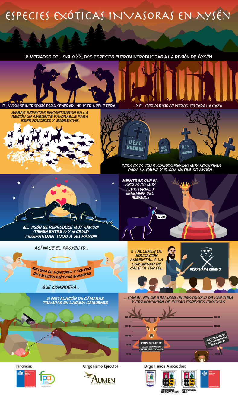 El Bien Nacional Protegido Laguna Caiquenes es un área protegida en la que se detectó la presencia de la especie invasora visón y, por tanto, se identificó la necesidad de generar un sistema preventivo de detección y control de esta especie. En este Proyecto se implementó un modelo experimental, diseñado de manera tal de poder hacerlo replicable para otras áreas protegidas en la región de Aysén; basado en la instalación de cámaras trampa en transectos localizados en cursos de agua.